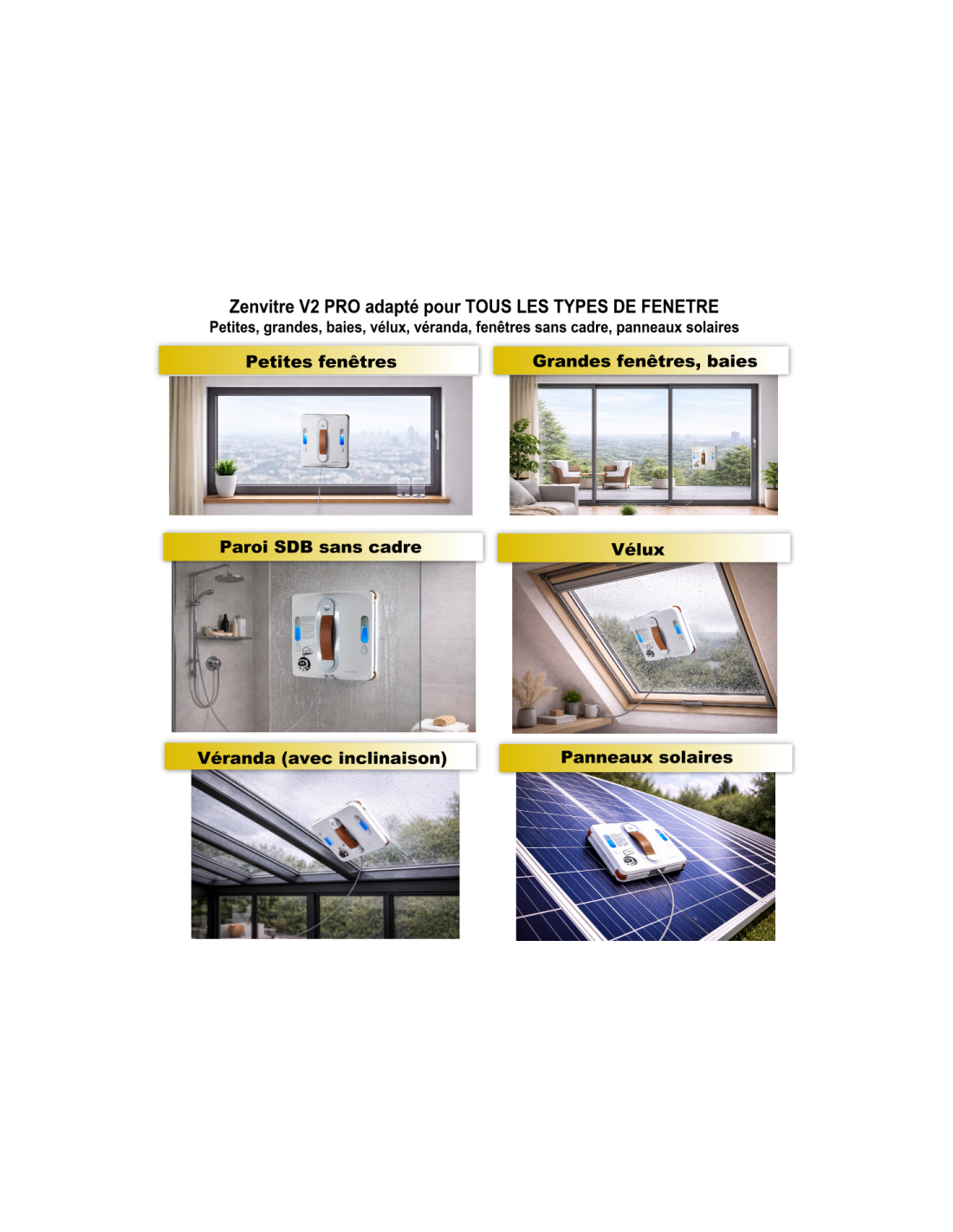 Je n'ai pas l'habitude de laisser des avis sur Internet lors de mes achats. Mais aujourd'hui j'aurais voulu remercier la société Zenvitre pour son robot qui est vraiment formidable et surtout l'équipe derrière qui nous aide à la moindre question. Le Robot est vraiment simple d'utilisation, nettoie vraiment parfaitement nos vitres, sans laisser pratiquement aucune tâche. Nous avions à l'époque un robot lave vitre que nous avions renvoyé car nous étions déçus, mais là avec le robot V2 PRO c'est le jour et la nuit. Rien à voir avec les anciens modèles, je manquerai pas de faire une excellente publicité de votre marque. Florence